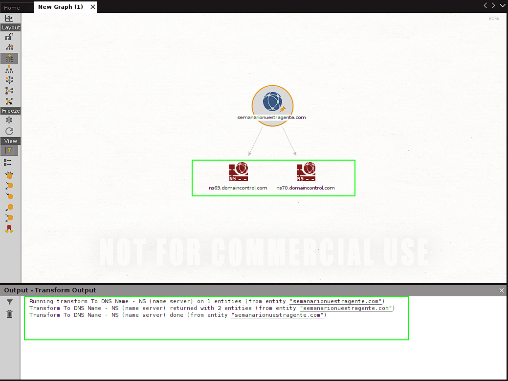 In this case we will try the transform (scan) called to DNS - NS (Name Server). By click it the selected scan/transform is executed. We see that after a moment new entities appear in our 2 . We can also see that each canvastransform/scan generates a log when executed that is shown in the output window below the In this way we see that we obtain both canvas: