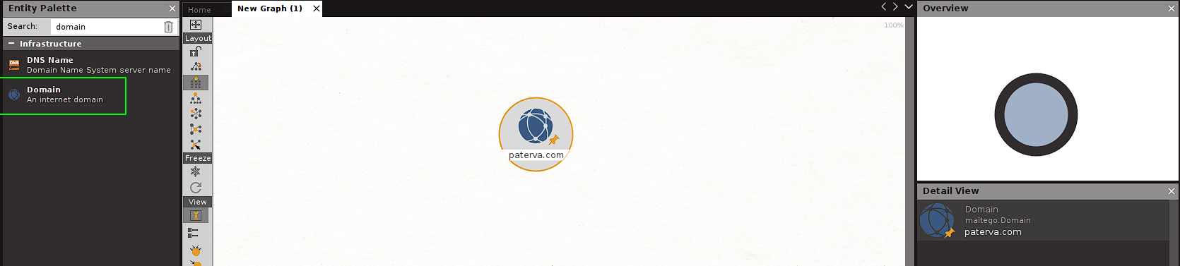 To add our entity to the canvas, just drag and drop it onto it. By default this entity points to paterva.com. We need to adjust that value and point it to our target. For that we have 2 ways: