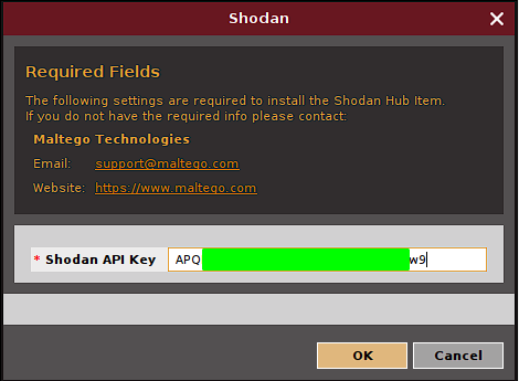 Some transforms like the one from Shodan, require an API Key to function and will ask for it during installation: