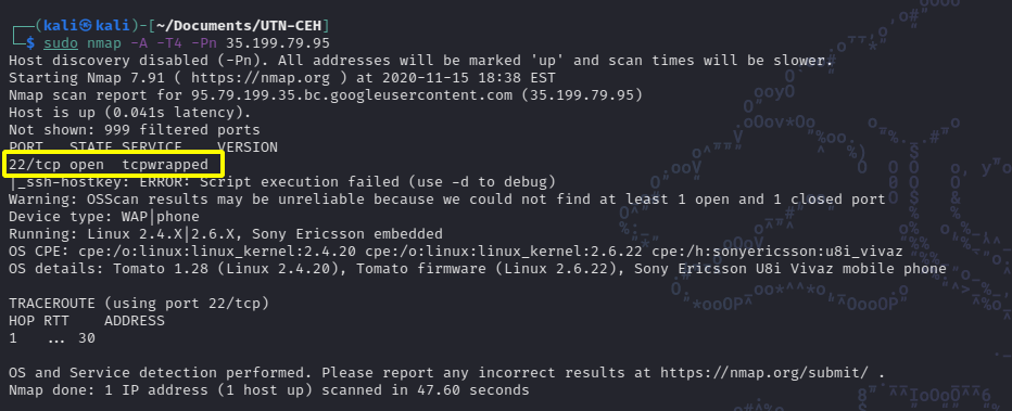 Como primer ejemplo usare el objetivo 35.199.79.95 al escanearlo con nmap vemos que dicho server tiene el puerto 22 abierto. Para esto usaremos nmap con una serie de switches o flags que nos permiten refinar el tipo de scan, velocidad y puerto.