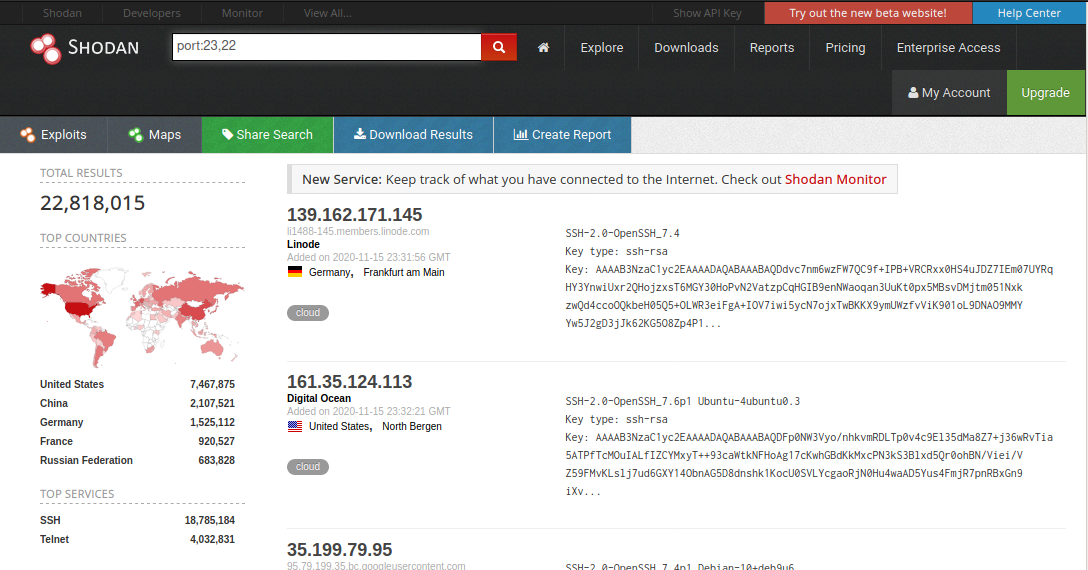 En esta mini-práctica veremos como usar Shodan para localizar servers que tengan determinados puertos abiertos. Para el caso de este ejemplo estamos interesados en encontrar los puertos 22 y 23 abiertos. Luego usaremos nmap para confirmar que dichos servidores en efecto tienen ambos puertos abiertos.