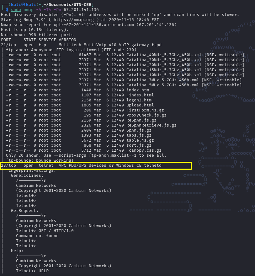 Una vez elegido el objetivo procedemos a escanearlo con nmap para confirmar que en efecto el puerto 23 esta abierto. En mi caso elegí 67.201.141.136 como objetivo: